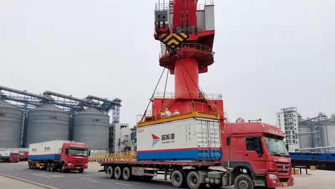 蘇北海豐大米“坐”進集裝箱,通過鐵路運輸發往上海。