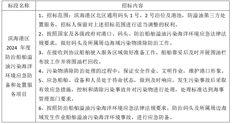 1、項目名稱:濱海港區 2024 年度防治船舶溢油污染海洋環境應急防備和處置服務項目