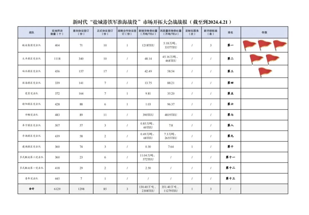 2.簽訂意向協(xié)議數(shù)量1298份:其中大豐港區(qū)突擊隊340份,黨員突擊隊164份,響水港區(qū)突擊隊157份,濱海港區(qū)突擊隊141份,巾幗突擊隊89份,射陽港區(qū)突擊隊88份,建湖港區(qū)突擊隊74份,航運集團突擊隊71份,阜寧港區(qū)突擊隊57份,亭湖港區(qū)突擊隊52份,多式聯(lián)運第一突擊隊29份,多式聯(lián)運第二突擊隊23份,青年突擊隊7份。