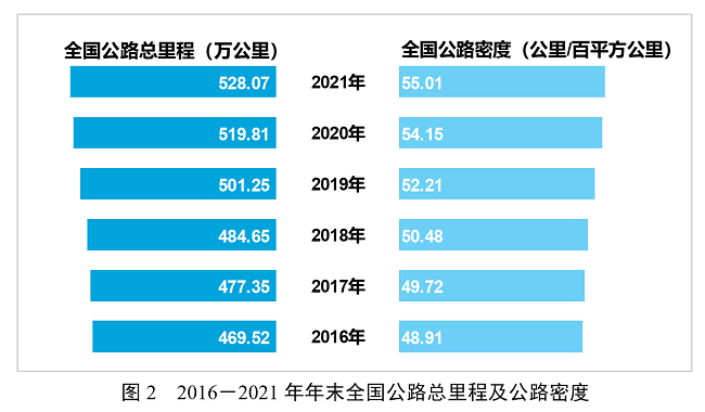 年末全國公路總里程528.07萬公里,比上年末增加8.26萬公里。公路密度55.01公里/百平方公里,增加0.86公里/百平方公里。公路養護里程525.16萬公里,占公路總里程比重為99.4%。