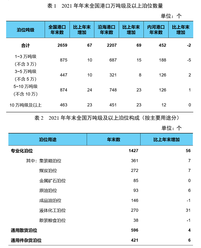 年末全國港口萬噸級及以上泊位2659個,比上年末增加67個。從分布結構看,沿海港口萬噸級及以上泊位2207個、增加69個,內河港口萬噸級及以上泊位452個、減少2個。從用途結構看,專業化萬噸級及以上泊位1427個、增加56個,通用散貨萬噸級及以上泊位596個、增加4個,通用件雜貨泊位421個、增加6個。