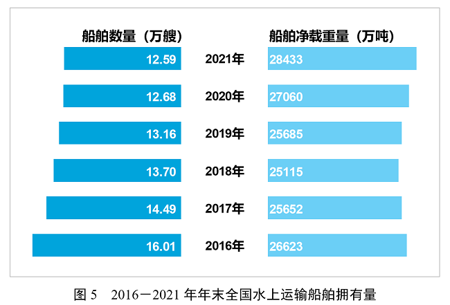 年末全國擁有水上運輸船舶12.59萬艘,比上年末下降0.7%,其中凈載重量28432.63萬噸、增長5.1%,載客量85.78萬客位、下降0.3%,集裝箱箱位288.43萬標準箱、下降1.6%。