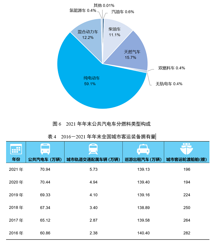 年末全國擁有城市公共汽電車70.94萬輛,比上年末增長0.7%,其中純電動車41.95萬輛、增長10.8%,占整個城市公共汽電車比重為59.1%、提高5.4個百分點。擁有城市軌道交通配屬車輛5.73萬輛,增長15.9%。擁有巡游出租汽車139.13萬輛,下降0.2%。擁有城市客運輪渡船舶196艘,增長1.0%。