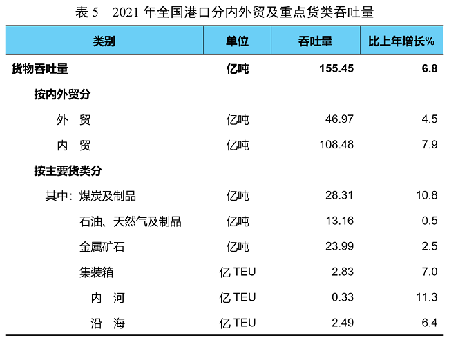 全年全國港口完成貨物吞吐量155.45億噸,比上年增長6.8%。其中,內河港口完成55.73億噸、增長9.9%,沿海港口完成99.73億噸、增長5.2%。完成集裝箱鐵水聯運量754萬TEU,增長9.8%。