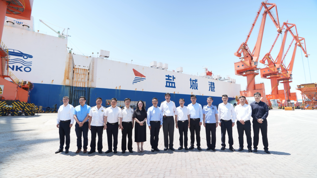 黃海新區、濱海縣、鹽城港集團主要領導和相關負責同志,市“一關兩檢”相關負責人親臨碼頭現場,一同觀看了汽車滾裝全流程作業。